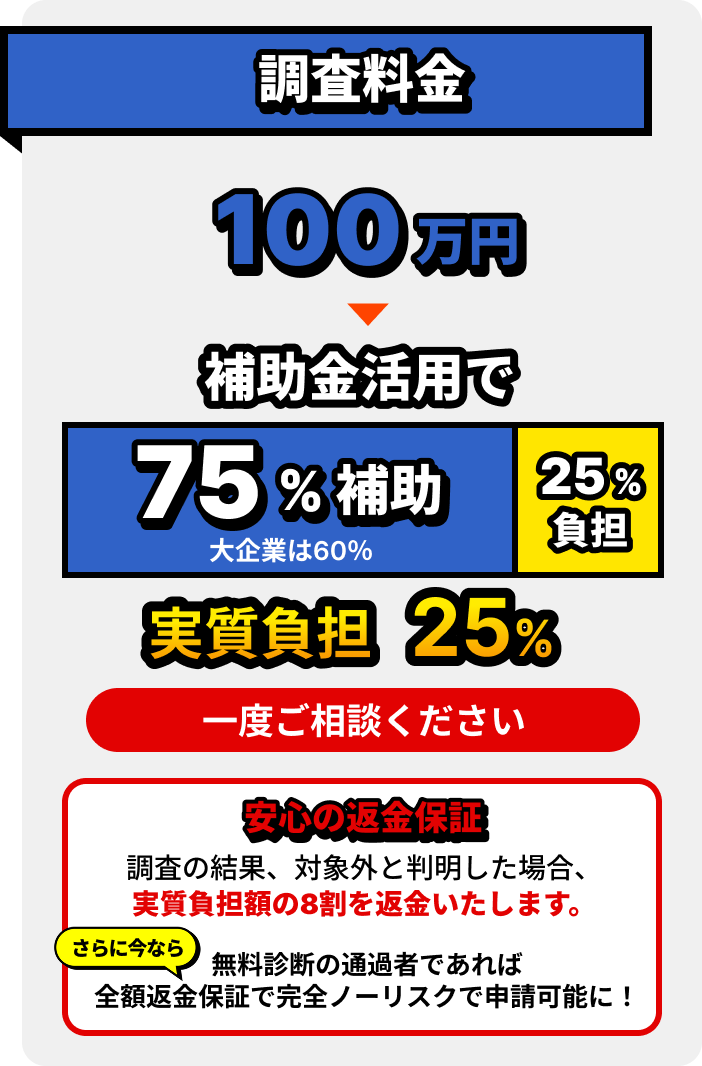 - はい、100%全額返金保証をお約束します。調査の結果、助成金対象外と判明した場合は、お支払いいただいた調査料金を全額返金いたします。完全リスクフリーでご利用いただけます。