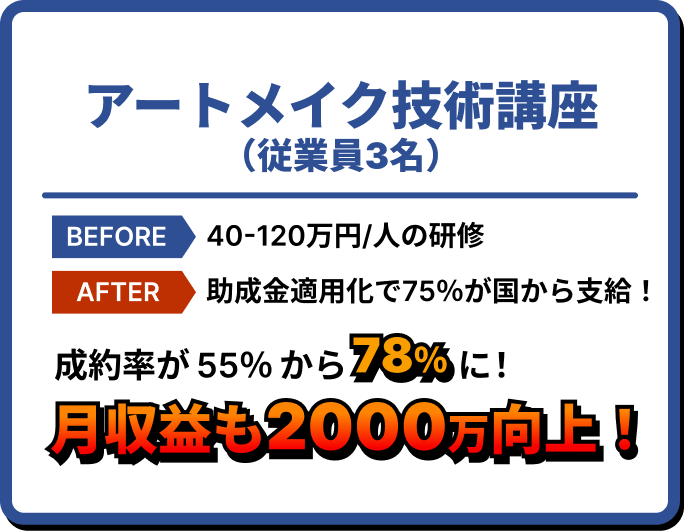 - はい、事業規模は一切関係ありません。個人事業主から大企業まで、研修内容が要件を満たしていれば対象となります。実際に当社では様々な規模の事業者様を成功に導いております。