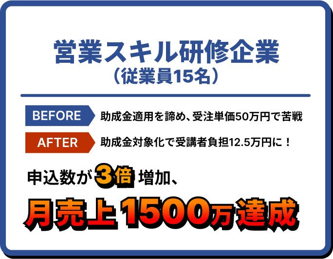 - はい、事業規模は一切関係ありません。個人事業主から大企業まで、研修内容が要件を満たしていれば対象となります。実際に当社では様々な規模の事業者様を成功に導いております。